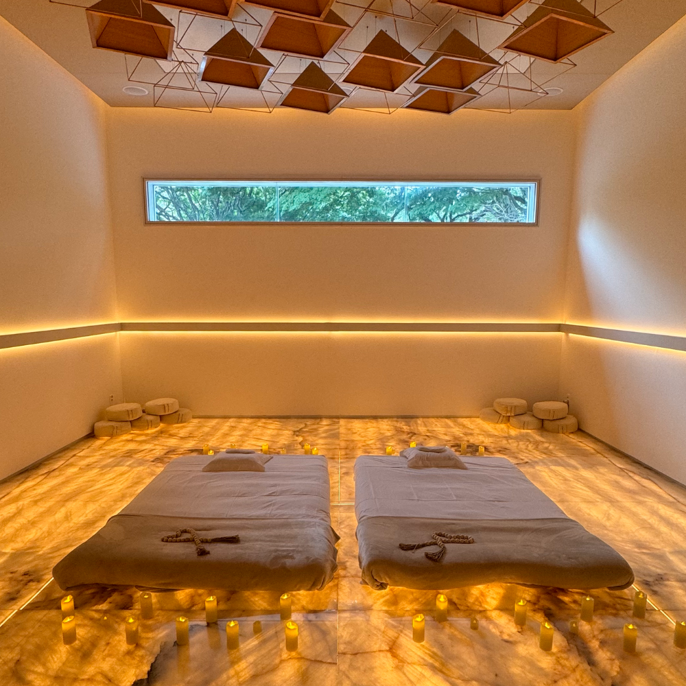 O piso de cristal de quartzo amplifica a frequência do corpo. As pirâmides de cobre suspensas canalizam e ordenam o campo energético. A luz suave preenche o ambiente com calma e acolhimento.